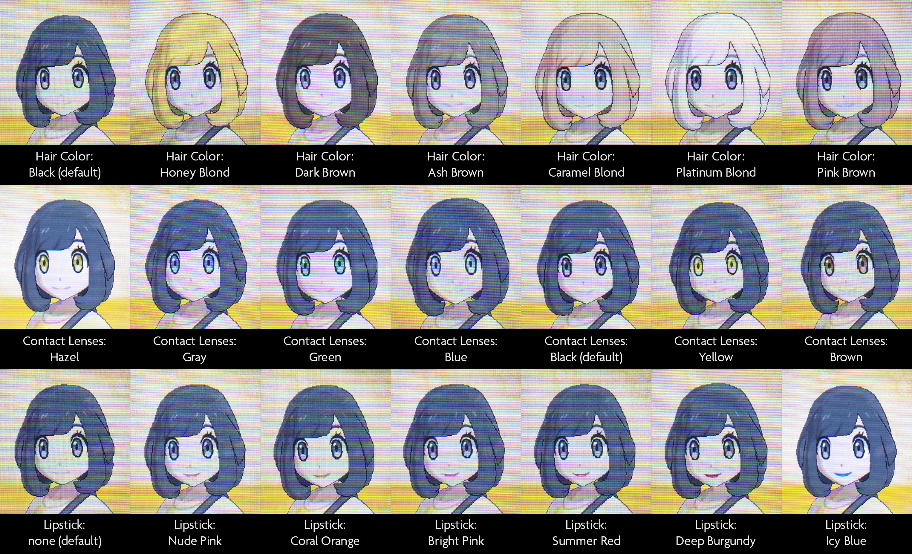There are also several lipstick colors: Nude Pink, Coral Orange, Bright Pink, Summer Red, Deep Burgundy, and Icy Blue. Pokemon Sun and Moon, for some reason, wants you to buy the haircuts and hairstyles blindly. Pokémon Sun & Moon - Trainer Customisation.